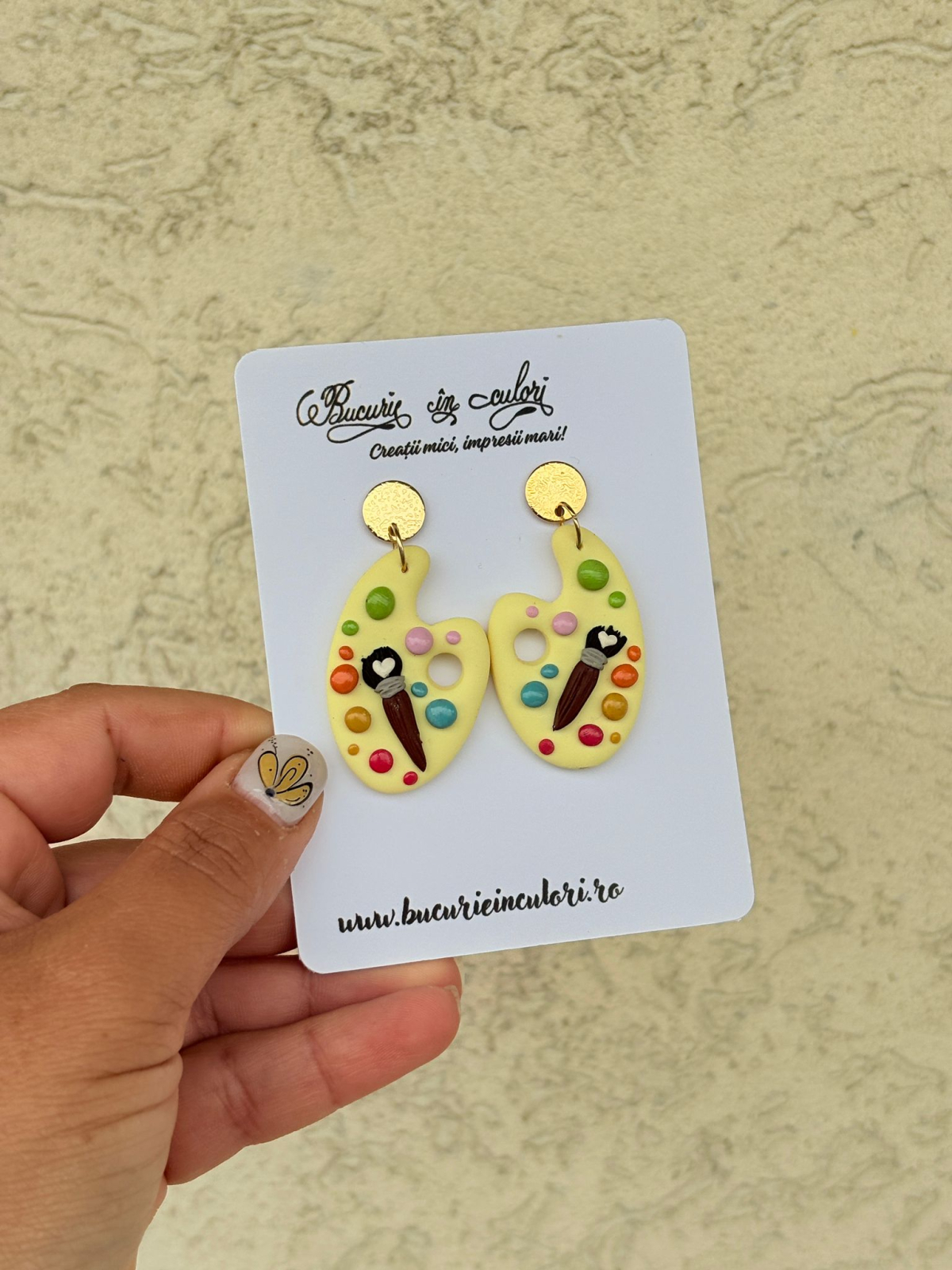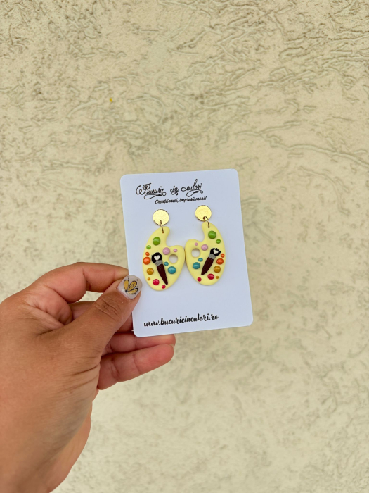 Adaugă o notă de culoare, creativitate și șarm artistic ținutei tale cu acești cercei unici, model paletă de pictor!