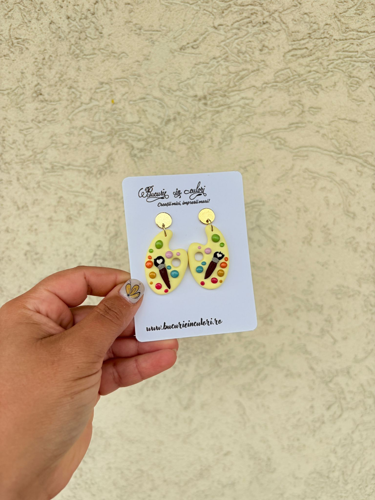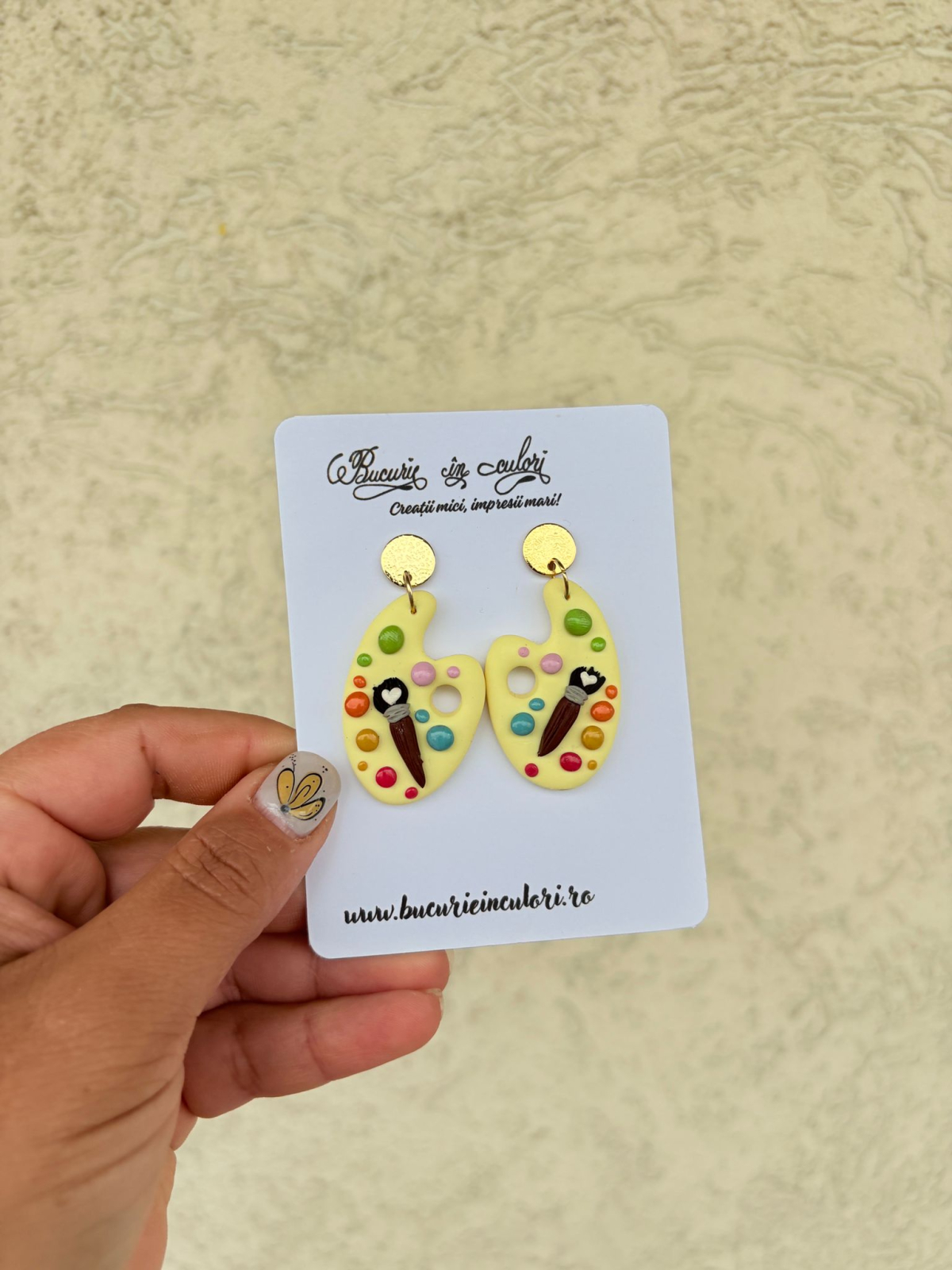 Realizați manual din pastă polimerică (fimo), acești cercei sunt o mică operă de artă în sine. Fiecare cercei reprezintă o paletă de pictură în nuanța veselă de galben-pai, decorată cu pete de culoare vii care imită vopseaua proaspătă și cu o pensulă miniaturală.