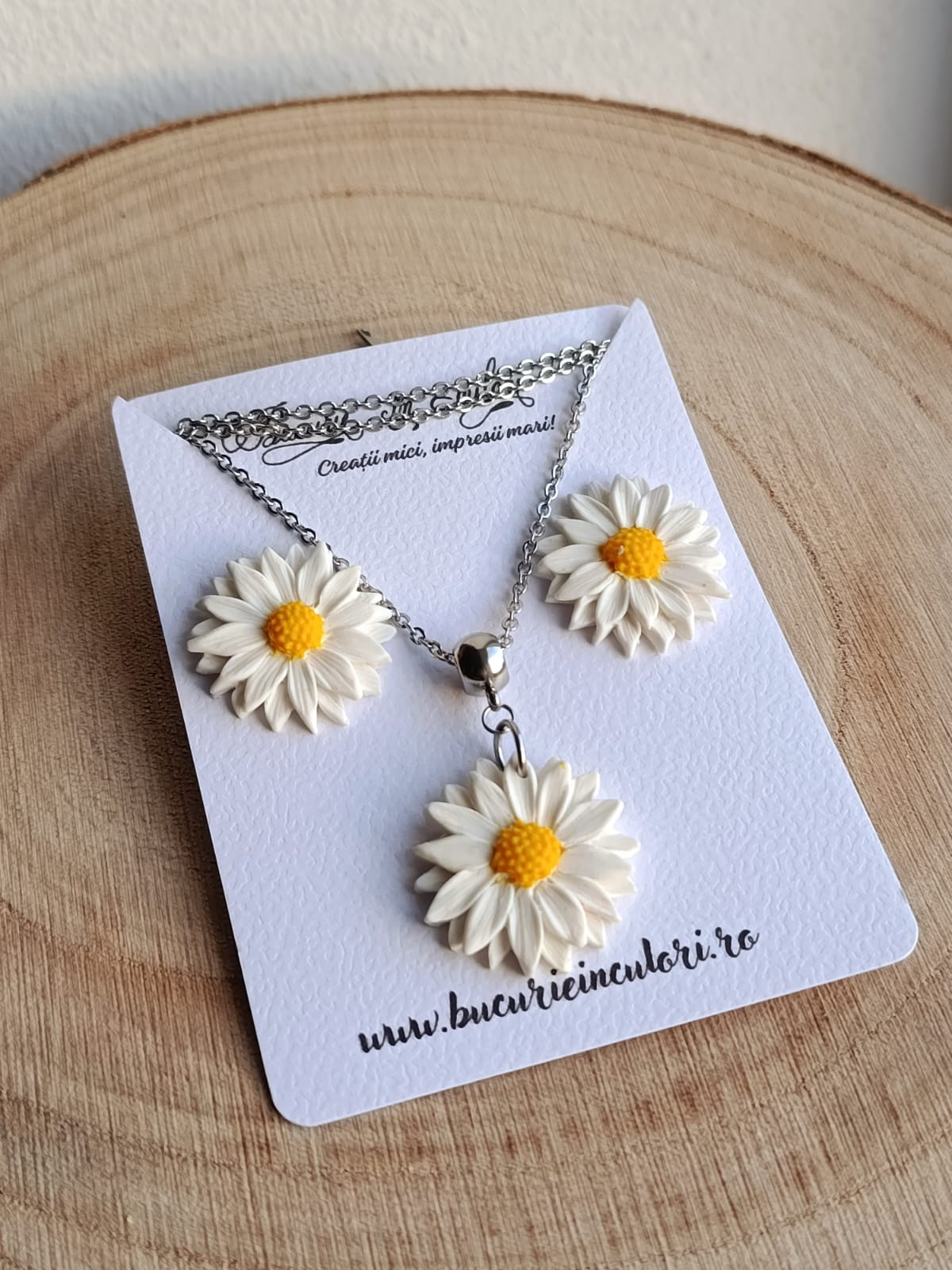 Un set delicat, inspirat din frumusețea simplă a naturii. Cerceii și colierul în formă de margarete sunt realizați manual din lut polimeric, cu petale fine și mijloc galben intens, care aduc bucurie și prospețime oricărei ținute.