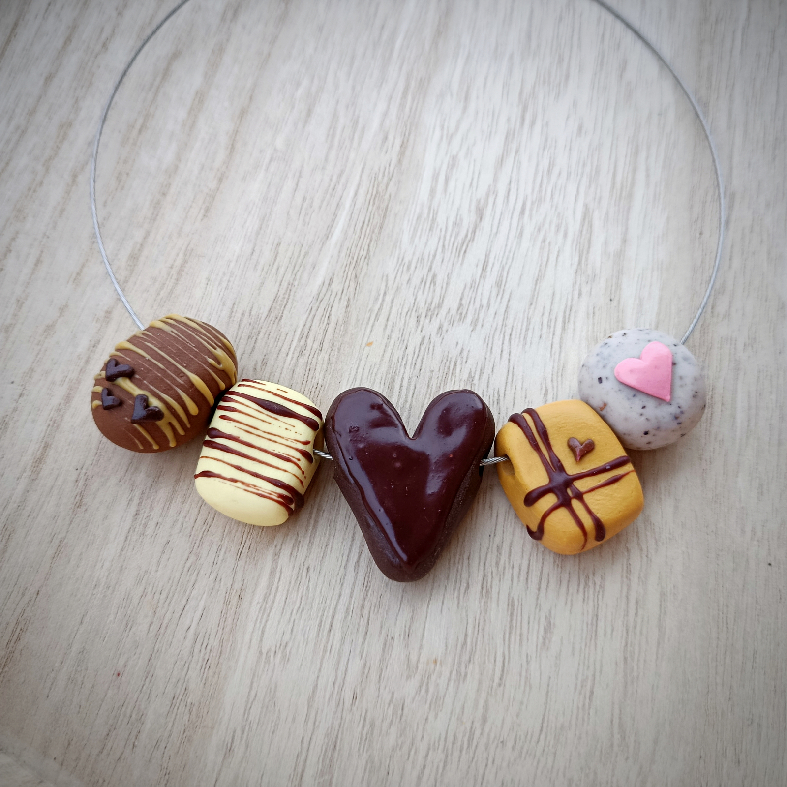 Colierul Sweet Madness este o capodoperă, modelată cu migală pentru a arăta exact ca un sortiment fin de praline artizanale. Fiecare "bomboană" este realizată integral din lut polimeric, de la inima centrală, bogată în ciocolată neagră, la pralinele decorate cu un strop de glazura apetisanta!